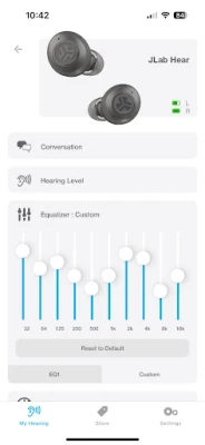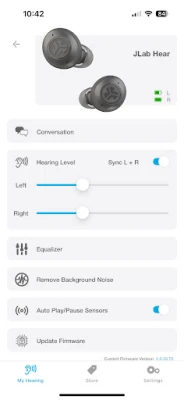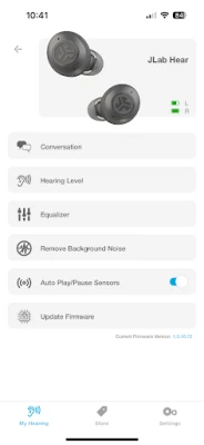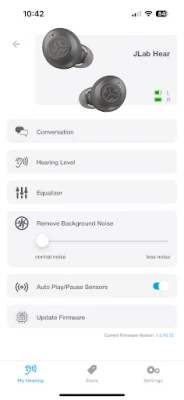 Pair JLab's Hear OTC Hearing Aid to unlock advanced customization options with the JLab Hearing Health App. Fine-tune your hearing experience by selecting and adjusting hearing presets, volume levels, EQ settings, background noise, and auto play/pause features. Stay up-to-date with firmware updates, ensuring your hearing aid is always optimized. Enjoy effortless control and precise adjustments to tailor your hearing experience exactly to your preferences.