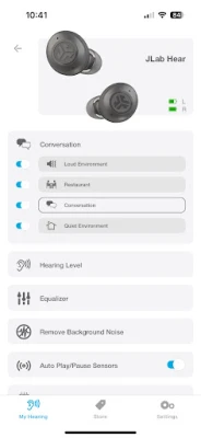 Experience tailored sound enhancement with four preset modes: Loud Environment, Restaurant, Conversation, and Quiet Environment, all adjustable to your preference. Whether you're in a bustling street, a crowded restaurant, engaged in conversation, or enjoying media alone, the JLab Hearing Health App with the Hear OTC Hearing Aid offers options for every environment. Simply adjust the presets to find the perfect balance and clarity for your hearing needs.