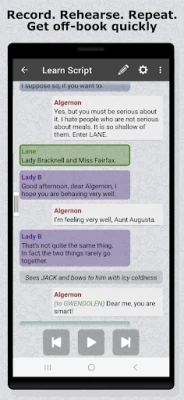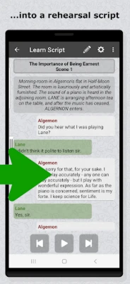 • Listen Along. Script Rehearser speaks, you listen. You can play, pause, and jump forward to your next line or back to your previous one.