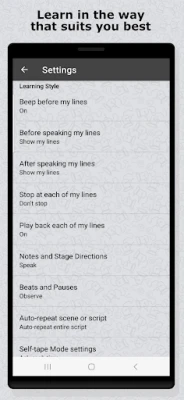 • Repeat for Confirmation. Script Rehearser leaves a gap for you to say the line, then automatically speaks the line for confirmation and carries on